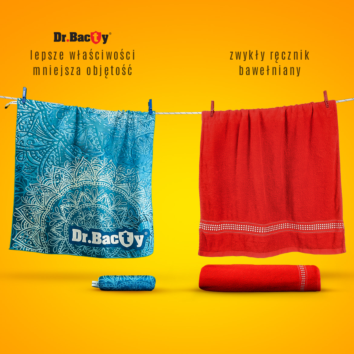 Zajmuje bardzo mało miejsca, jest ultralekki i superchłonny. W połączeniu z wyjątkowymi nadrukami w intensywnych kolorach i miękką, przyjemną dla skóry fakturą każdy ręcznik Dr.Bacty stanie się królem każdej podróży i każdej z plaż. Najlepsza alternatywa dla standardowego ręcznika bawełnianego.