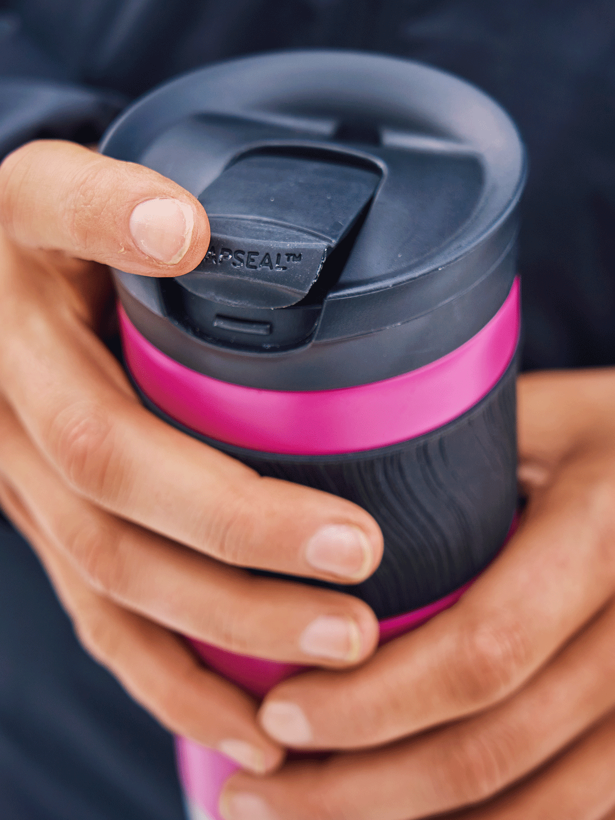 Schieben Sie den Kappenverschluss mit dem Daumen nach oben und trinken Sie, schieben Sie ihn nach unten - und sichern Sie das Mundstück. Könnte es noch einfacher sein als das? Dank der beschriebenen Snapseal-Technologie, die auf einem Schnappverschluss basiert, ist der Byron 2.0 Becher extrem einfach mit einer Hand zu bedienen. Das beschriebene System sorgt dafür, dass das Produkt vollständig versiegelt ist und Sie es sogar nach Belieben auf den Kopf stellen können.