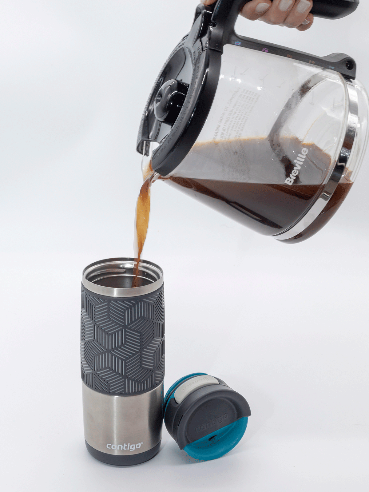 Sie möchten den Kaffee, den Sie in Ihren Contigo Transit Thermobecher gefüllt haben, trinken? Drücken und halten Sie den AutoSeal-Knopf an der Seite des Deckels, um den Verschluss des Mundstücks zu lösen. Wenn Sie die Taste loslassen, rastet die Verriegelung wieder ein und schützt Ihr Getränk vor dem Ausgießen. Sie können diese Technologie ganz einfach mit einer Hand bedienen.