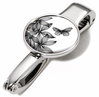 - Interessantes Geschenk für den Kunden. Griff und Clip für die Handtasche, Motiv: SCHWARZE BLUMEN, Tragfähigkeit bis zu 5 kg, Metall, glänzend, schwarz/weiß.
