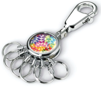- Toll als Firmengeschenk. Schlüsselanhänger mit Karabinerhaken, Motiv: BUNTE BLÄTTER, 6 austauschbare Ringe, Metall, verchromt, glänzend, mehrfarbig.