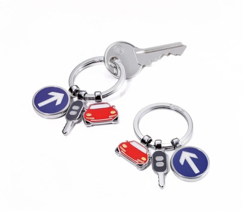 - Firmengadget. Schlüsselanhänger mit 3 Anhängern, Auto, Autoschlüssel, Verkehrsschild, verchromt, glänzend, mehrfarbig.