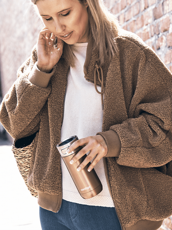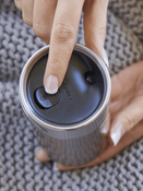 - Hot contents can create pressure and release hot steam. Always press the button while holding the cup upright, away from your face, this will allow the pressure to be properly relieved before drinking.