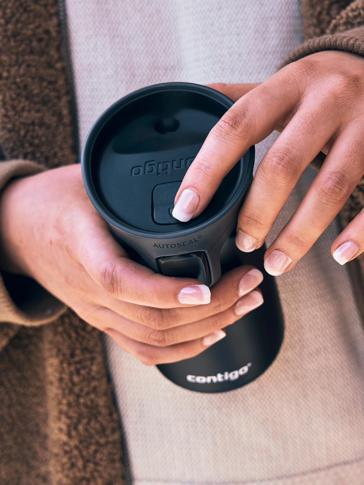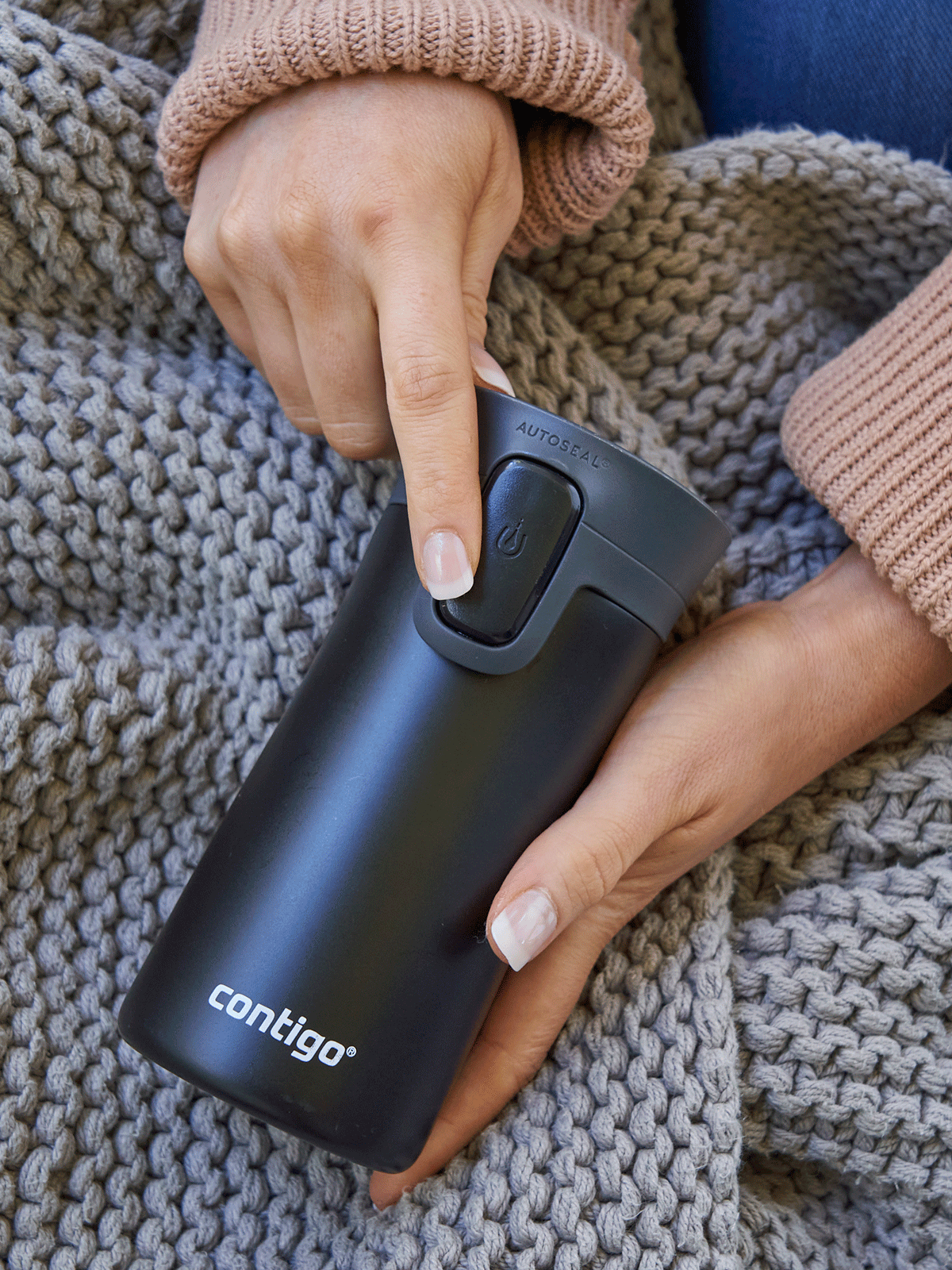 You want to drink the coffee you poured into the Contigo Pinnacle mug? Press and hold the AutoSeal button built into the side of the cap, which will release the mouthpiece lock. Release the button and the lock will reengage protecting your drink from spills. An additional lock button at the top of the cap will protect the system from the risk of accidental opening in your purse or backpack. The entire locking system can be calmly operated with 1 hand even while driving a car.