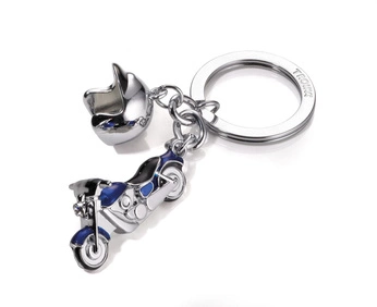 - Corporate gadget. Keychain with 2 charms, motorcycle and helmet, made of SWAROVSKI® ELEMENTS, metal casting, chrome-plated, shiny, blue/silver color.