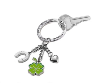 - Interesting gift for a client. Keychain with 3 charms: horseshoe, clover leaf, small heart, engraving on XL ring: 'Luck' in various languages, metal casting, enamel, chrome-plated, shiny, green/silver color.