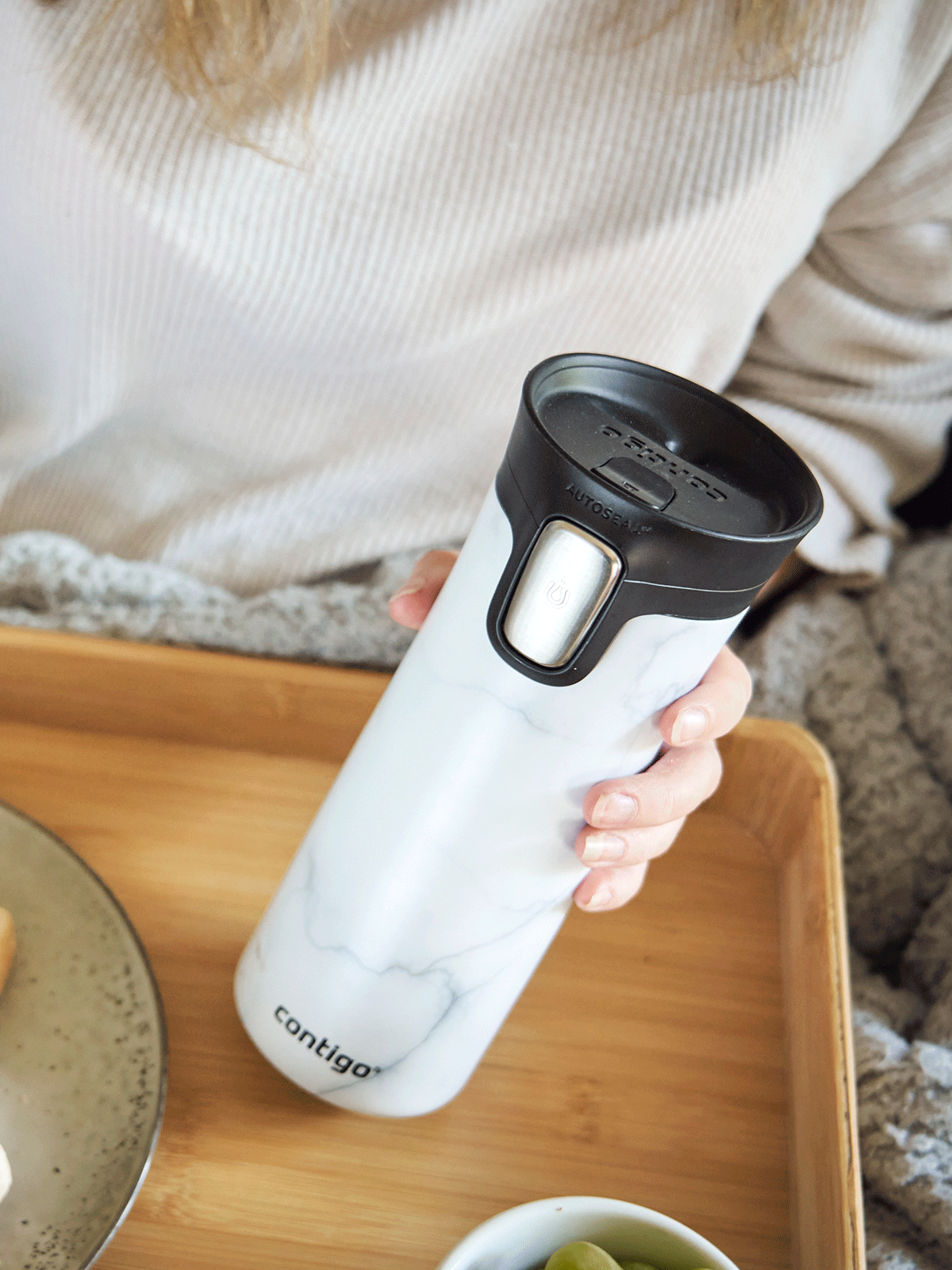 Chcesz napić się kawy, którą wlałeś do kubka Contigo Pinnacle Couture? Naciśnij i przytrzymaj przytrzymaj przycisk AutoSeal wbudowany w boczną ściankę nakrętki, który zwolni blokadę ustnika. Zwolnij przycisk a blokada ponownie się uruchomi chroniąc napój przed rozlaniem. Dodatkowy przycisk blokady umieszczony w górnej części nakrętki zabezpieczy system przed ryzykiem przypadkowego otwarcia w Twojej torebce lub plecaku. Cały system blokowania spokojnie obsłużysz 1 ręką nawet podczas jazdy autem.