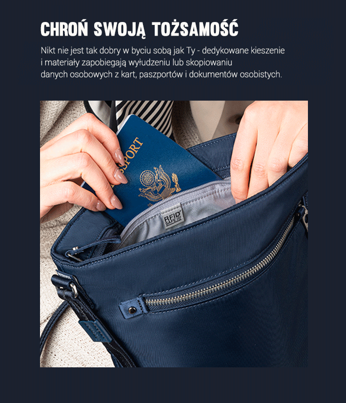 - Specjalna kieszeń chroni karty oraz dokumenty wykorzystujące technologię RFID przed zeskanowaniem i kradzieżą tożsamości