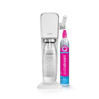- SodaStream ART biały – kompaktowy, bezprzewodowy ekspres do gazowania wody z eleganckim retro designem i metalowymi akcentami. Zestaw zawiera urządzenie, cylinder CO2 Quick Connect i butelkę FUSE 1L z Tritanu (bez BPA).