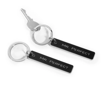 - Designerski upominek dla firmy Brelok do kluczy z napisem "MR. PERFECT', kształt podłużny, odlew metalowy, emalia, chromowany, błyszczący, kolor czarny/srebrny.