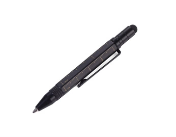 - Designerski upominek dla firmy Wielozadaniowy długopis (mały), linijka centymetrowa i calowa, śrubokręt płaski i krzyżakowy, rysik (czarny), czarny wkład, w komplecie 2 wkłady, aluminium, mosiądz, stal, lakierowany, matowy, czarny/złoty